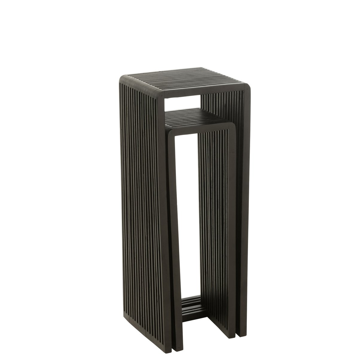 Deze set van twee bijzettafels in zwart gerecycled teak is een subtiele blikvanger voor ieder interieur. Het grafische kubusontwerp voelt strak én natuurlijk, met een diepe zwarte afwerking die karakter geeft zonder hard te worden. Gemaakt van gerecycled hout passen deze tafels moeiteloos in een rustige, stijlvolle setting.