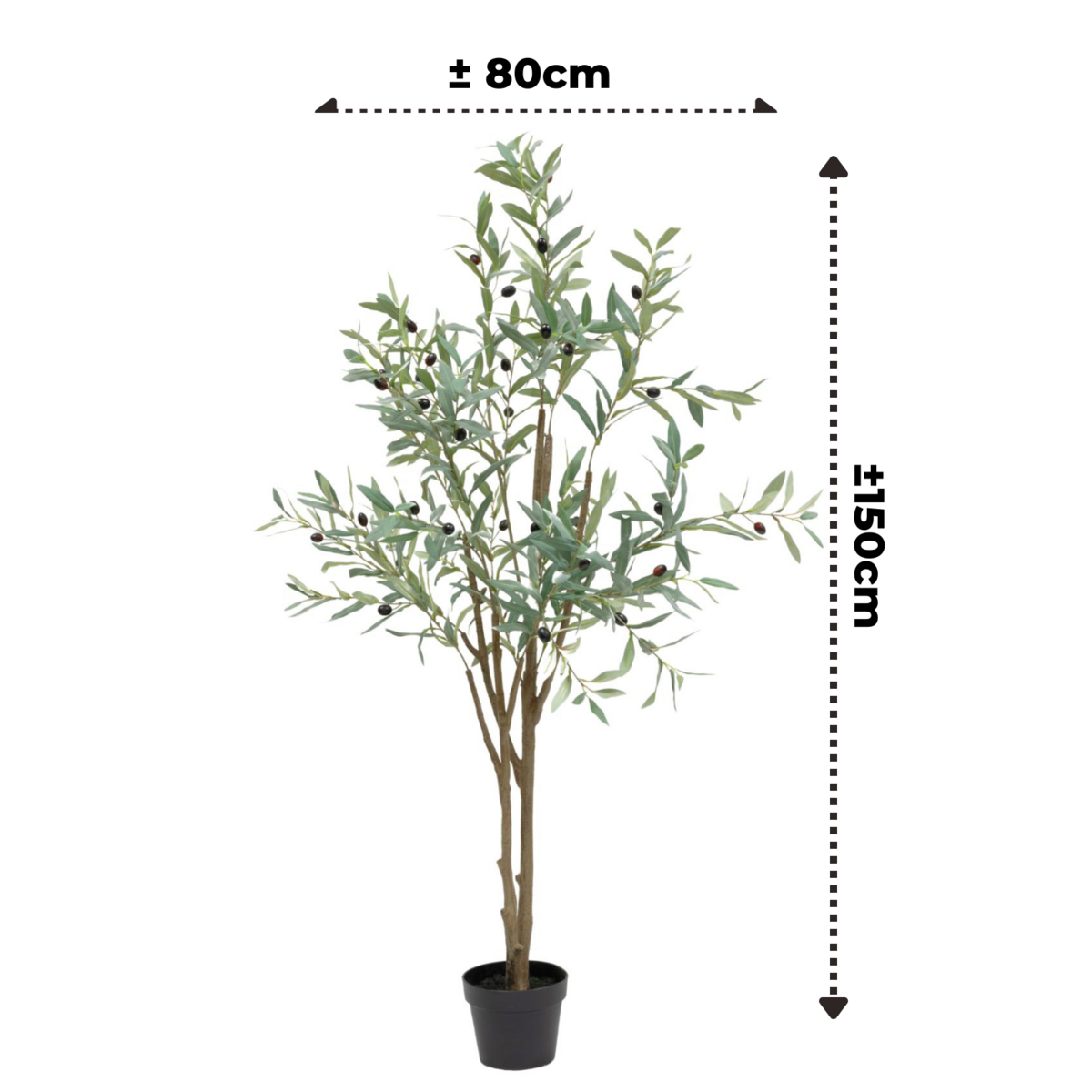 De olijfboom is 150 cm hoog en heeft een natuurlijke kruindiameter van ongeveer 80 cm. De zwarte kweekpot waarin hij geleverd wordt is 15 cm hoog en heeft een diameter van 17 cm.